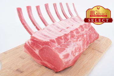 A cut of pork that includes the ribs still attached to the meat. This cut is often prepared and served as a festive centrepiece for special occasions or holiday meals.